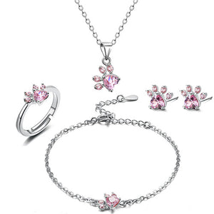 New Fashion Cat Bear Dog Paw Ring for Women Jewelry Sets White CZ Stone Silver Gold Rings Necklace Bracelet Earring Set